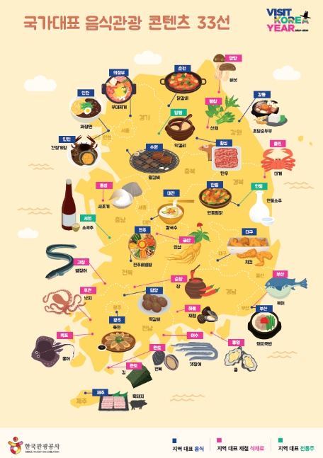 ‘국가대표 음식관광 콘텐츠 33선’은 외식·관광업계와 학계, 홍보마케팅 분야 전문가들로 구성한 음식관광 자문단을 통해 각 지역을 대표하고 다른 나라와 차별화되는 한국의 음식 콘텐츠를 ▴지역 대표 음식, ▴지역 대표 제철 식재료, ▴지역 대표 전통주 등 3가지 주제로 구분해 선정했다.