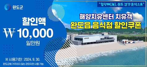 [남도저널 양용숙 기자] 완도군은 여름 휴가철을 맞아 7월 13일부터 해양치유센터 이용객을 대상으로 음식점 할인 쿠폰을 증정하는 이벤트를 추진한다.