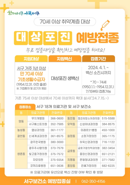 [남도저널 김홍열 기자] 광주광역시 서구는 대상포진 무료 예방접종 대상자를 기존 75세 이상에서 70세 이상으로 확대한다.