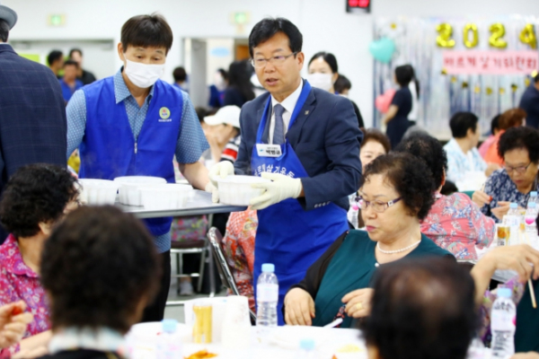 [남도저널 김홍열 기자] 박병규 광산구청장이 12일 초복을 앞두고 지역 어르신들의 건강을 응원하며 건강 삼계탕 배식 봉사를 펼쳤다.