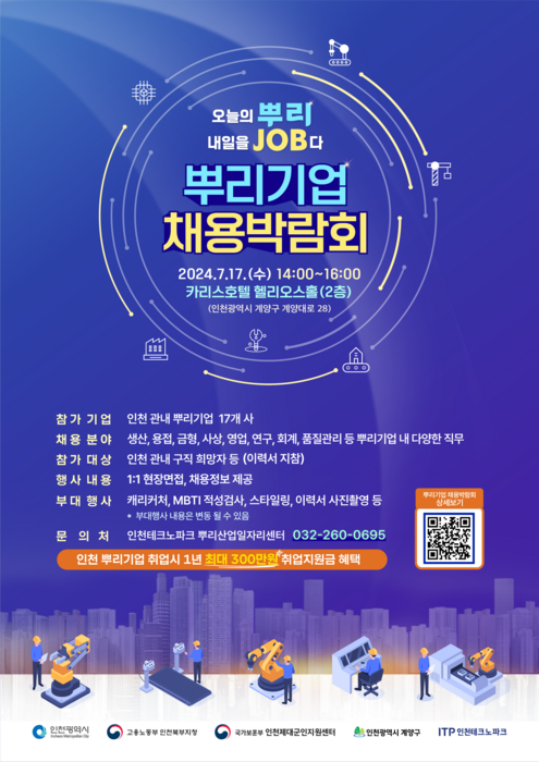[남도저널] =인천테크노파크는 오는 17일 인천광역시, 중부지방고용노동청(북부고용센터), 인천보훈지청 인천제대군인지원센터, 계양구와 함께 '뿌리기업 채용박람회'를 공동 개최한다고 15일 밝혔다.