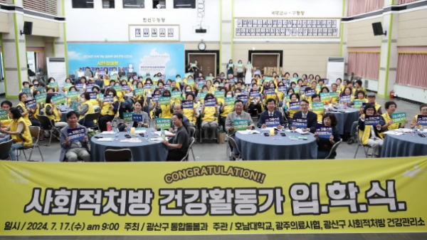 광산구는 17일 구청 7층 윤상원홀에서 호남대학교와 함께 ‘사회적처방 건강활동가 양성 교육 입학식’을 개최했다.
