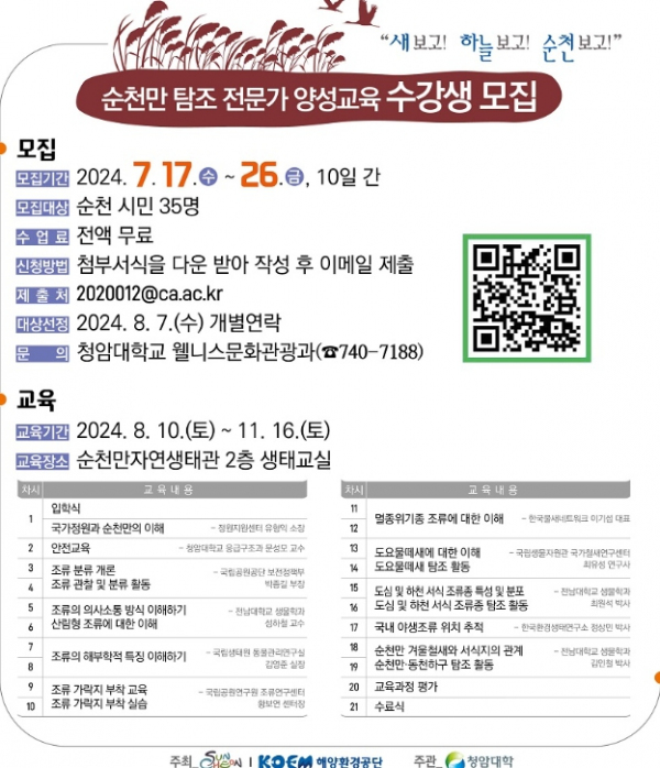 모집대상은 순천 관내 거주하고 새에 관심 있는 19세 이상 성인이면 누구나 지원할 수 있다. 신청방법 및 세부사항은 순천만습지 누리집 공지사항에서 확인할 수 있으며, 모든 교육 과정은 무료로 진행된다.