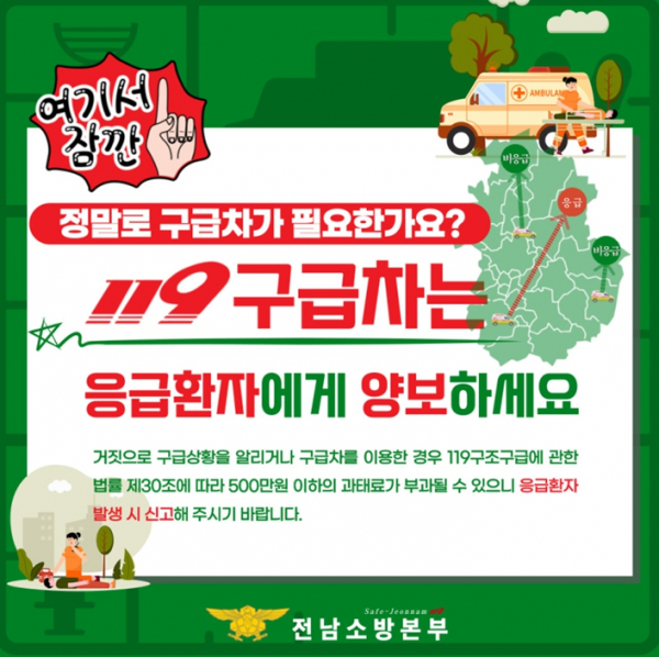 [남도저널 김승귀 기자] 해남소방서(서장 최진석)는 응급환자의 골든타임 확보를 위해 비응급환자의 119구급 신고 자제를 당부드린다고 17일 밝혔다.