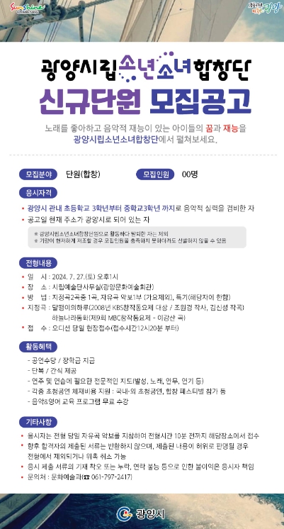 모집 기간은 오는 7월 27일 하루로, 당일 광양문화예술회관 시립소년소녀합창단 연습실에 직접 방문해 접수해야 한다.