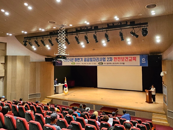 [남도저널 김용범 기자] 화순군은 지난 18일 하니움문화스포츠센터에서 근로자 및 사업담당자 90명을 대상으로 '2024년 하반기 공공일자리사업 2차 안전보건교육을 실시했다고 밝혔다.