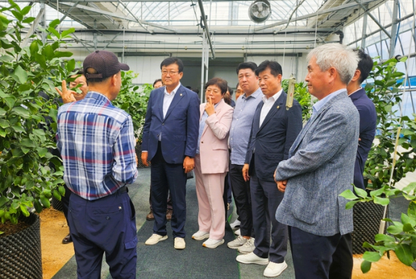 이날, 삼서면 삼계리 소재 레몬 재배농가를 찾은 전남도의회 농수산위원회 위원들은 현지 농업인들로부터 애로 및 건의사항을 듣고, 아열대작물 재배 현장에 필요한 행정적 지원에 대해 의견을 나눴다.