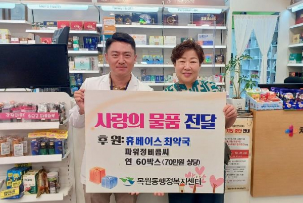 [남도저널 박기철 기자] 목원동 소재 휴베이스 최약국이 저소득 취약계층 건강관리를 위한 비타민 영양제를 지난 17일 기탁했다.