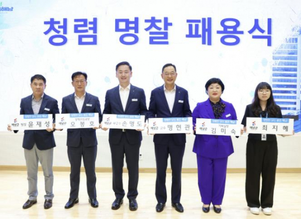 한편 보고회에 앞서 명현관 군수와 손명도 부군수를 비롯한 전 직원은 앞으로 업무시간 중 자신의 이름이 들어간 명찰을 패용하기로 하고, 보다 친절하고, 청렴한 자세로 일할 것을 다짐하는 의미에서 청렴명찰 전달식을 가졌다.