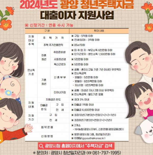 이 사업은 민선 8기 청년 주거 지원 대표 공약으로, 19세부터 39세까지 광양에 거주하거나 거주 예정인 무주택자에게 주택 구입 또는 전세(임대)에 따른 대출이자를 지원하는 사업이다.