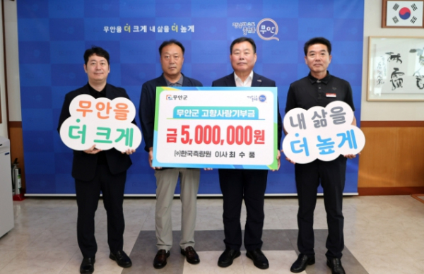 [남도저널 박기철 기자] 전남 무안군은 ㈜한국측량원 최수풍 이사가 작년에 이어 올해도 무안군에 고향사랑기부금 500만원을 기탁하고 지역 발전에 따뜻한 응원을 보냈다고 24일 밝혔다.