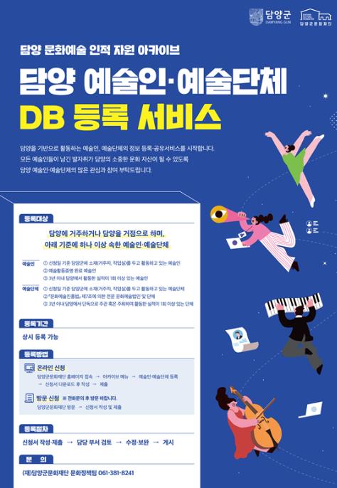 예술인·예술단체 DB 등록에 관한 자세한 사항은 담양군문화재단 홈페이지를 통해 확인할 수 있으며 (재)담양군문화재단 문화정책팀에 문의하면 된다.