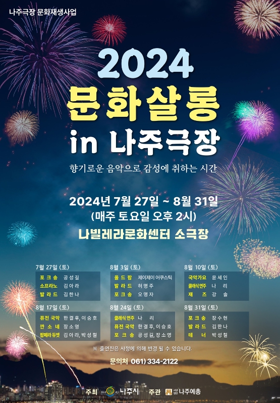 시는 (사)한국예술문화단체총연합회 나주지회와 함께 퓨전 국악, 포크, 팝페라, 클래식, 발라드 등 다채로운 음악 장르를 넘나드는 공연을 주민들에게 선보일 예정이다.