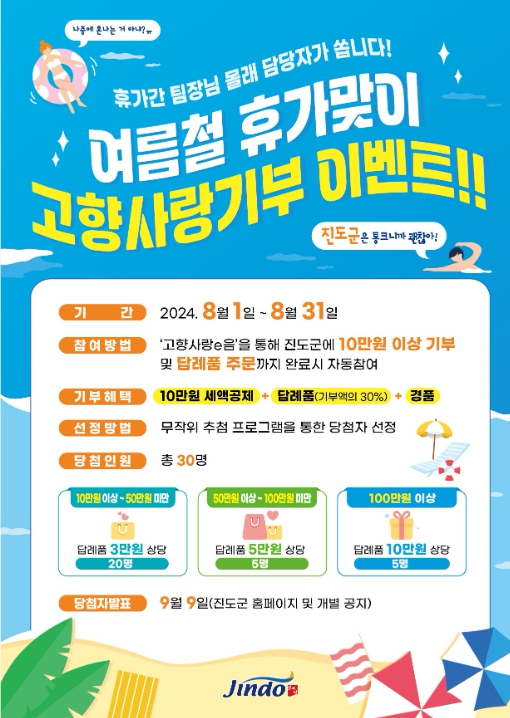 [남도저널 김승귀 기자] 진도군이 여름 휴가철을 맞아 고향사랑기부 인증 이벤트를 연다.