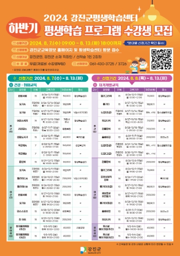 [남도저널 양용숙 기자] 강진군 평생학습센터가 8월 7일부터 2024년 하반기 평생학습 수강생을 선착순 모집한다.