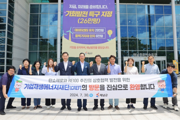 해남군은 지난 4월 재단에서 주최한 2024 한국 재생에너지 매칭포럼에 참석해 기초지자체로는 처음으로‘해남, 재생에너지 미래를 바꾼다’를 주제로 기조 발표하고, 솔라시도 RE100 산업벨트에 대한 투자설명회와 B2B(기업간 거래)에도 참여해 많은 관심을 모은 바 있다.