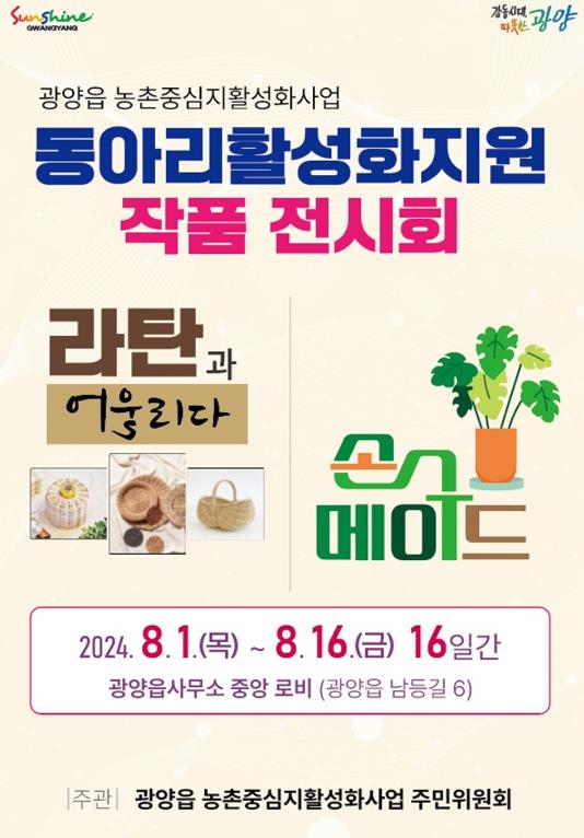 한편 광양읍 농촌중심지 활성화사업 동아리활동지원사업 작품전시회는 광양읍 주민 누구나 참여 가능하며, 전시 관련 자세한 사항은 주민위원회 사무실로 문의하면 된다.