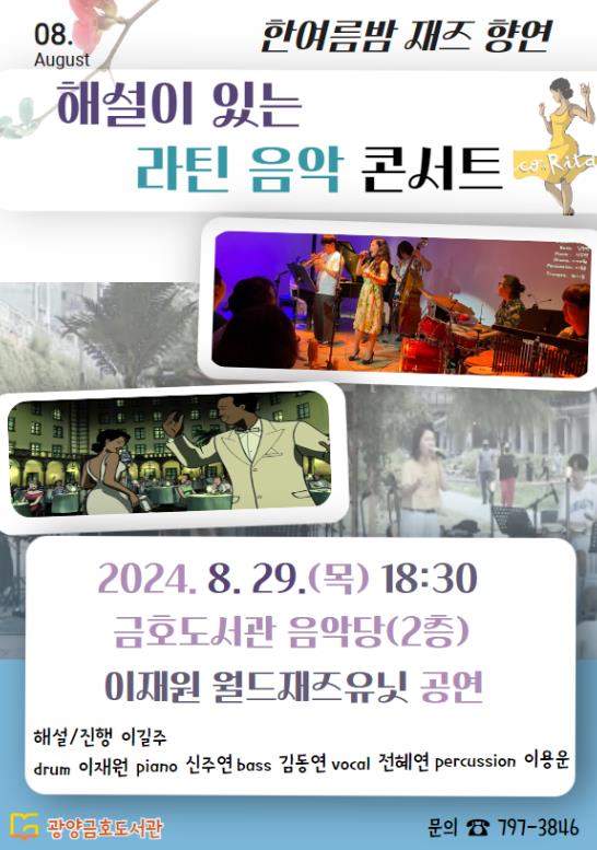 [남도저널 김영도 기자] 광양금호도서관이 오는 8월 29일 목요일 18시 30분, 금호도서관 음악당에서 광양시민 80명을 대상으로 예술 특화 행사 ‘해설이 있는 한여름 밤 재즈 향연 – 해설이 있는 라틴 음악 콘서트’를 개최한다.