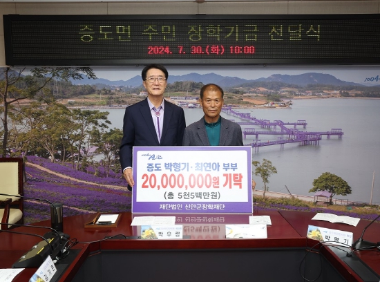 [남도저널 봉현구 기자] (재)신안군장학재단은 증도면(장고마을) 박형기·최연아 부부가 지난 30일 신안군청을 방문해 2,000만 원의 장학금을 기탁했다고 밝혔다.