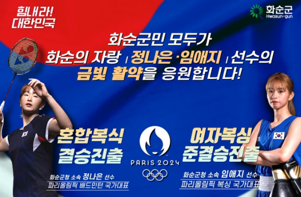 [남도저널 김용범 기자] 화순군은 2일 배드민턴 정나은 선수, 복싱 임애지 선수가 2024 파리올림픽 메달을 획득했다고 밝혔다.