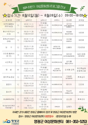 교육 기간은 9월부터 12월까지 운영되며 과목별 수업시간 및 수업내용은 영광군 누리집(홈페이지) 게시판을 통해 확인할 수 있다. 기타 자세한 사항은 여성문화센터 또는 영광군 가정행복과로 문의하면 된다.