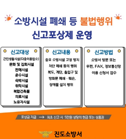 [남도저널 김승귀 기자] 진도소방서는 피난통로 확보와 화재 안전관리 강화를 위해 비상구 폐쇄 및 소방시설 차단 등 불법행위 신고포상제를 연중 상시 운영하고 있다고 밝혔다.