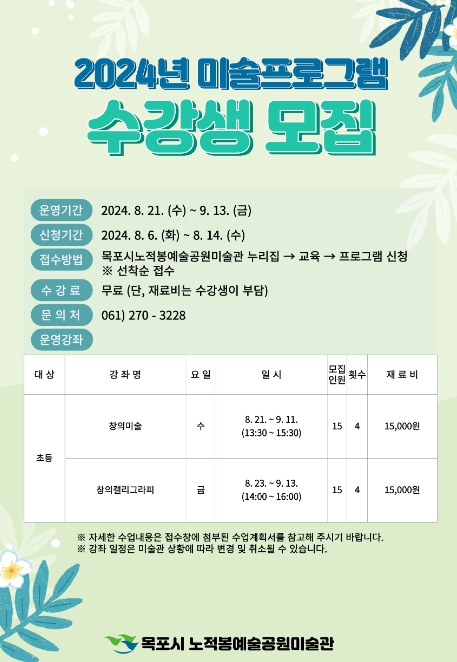 이번 프로그램은 창의미술, 창의캘리그라피로 구성되어 있으며 수강신청은 오는 6일부터 14일까지 노적봉예술공원미술관 누리집을 통해 가능하며 선착순으로 마감된다.