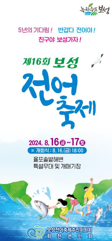 [남도저널 서인호 기자] 보성군은 ‘5년의 기다림! 반갑다 전어야! 친구야 보성가자!’라는 주제로 8월 16일부터 17일까지 율포솔밭해수욕장 일원에서 ‘제16회 보성전어축제’를 개최한다고 밝혔다.