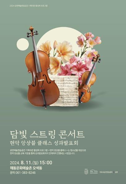 [남도저널 김종민 기자] (재)담양군문화재단은 오는 8월 11일 오후 3시 해동문화예술촌 오색동에서 ‘담빛 스트링 콘서트’를 개최한다.