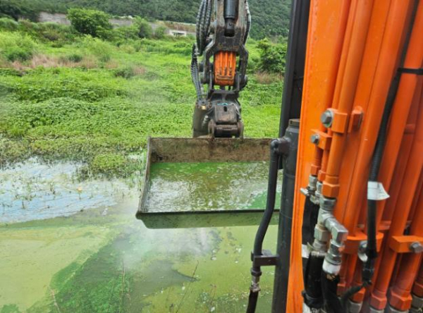 이튿날인 8/1일에는 하천 상류에 햇볕을 차단하는 차광막을 쳐서 녹조의 발생과 저수지 유입을 저지하고, 굴삭기를 투입해 하천과 저수지에 떠 있는 녹조를 퍼냈다.