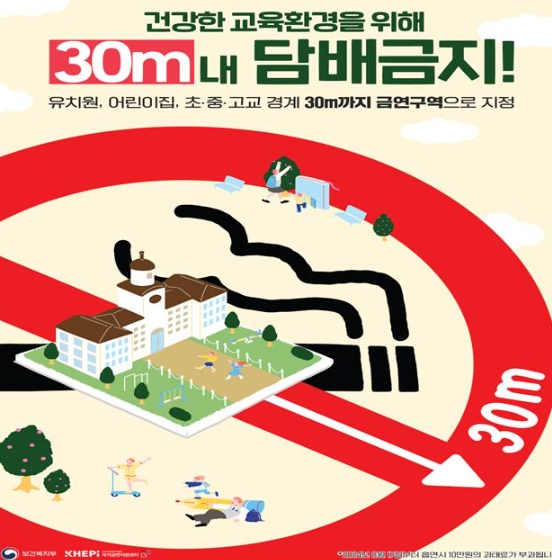 기존 어린이집, 유치원 시설 경계선에서 10미터 이내였던 금연 구역이 어린이집, 유치원 및 학교 시설의 경계선으로부터 30미터 이내로 확대된 것이다.