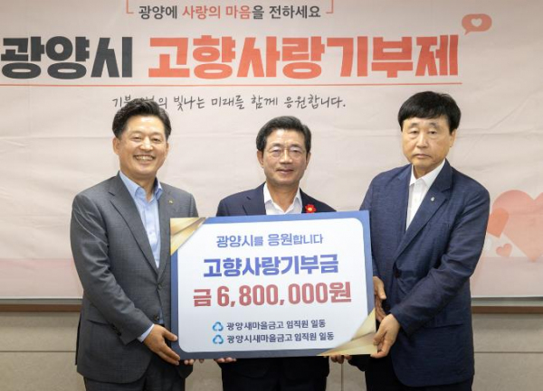 [남도저널 김영도 기자] 광양시`는 9일 광양새마을금고와 광양시새마을금고 임직원 68명이 고향사랑기부제 활성화와 기부문화 확산을 위해 상호기부에 동참해 고향사랑기부금 680만 원을 전달했다고 밝혔다.