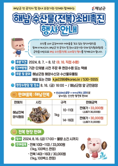 [남도저널 김승귀 기자] 해남군이 경기침체와 소비부진으로 어려움을 겪고 있는 전복의 소비촉진을 위한 캠페인에 나섰다.