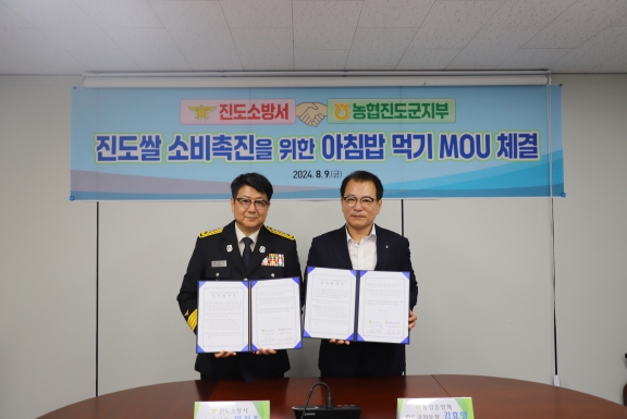 [남도저널 김승귀 기자] NH농협 진도군지부와 진도소방서는 9일 진도쌀 소비촉진을 위한 아침밥 먹기 업무협약(MOU)을 체결했다.