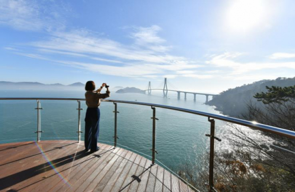 3개의 원형공간이 절벽을 향해 층층이 겹쳐진 형태로 조성된 전망대 끝자락에선 거가대교와 푸른 바다를 한눈에 담을 수 있다.