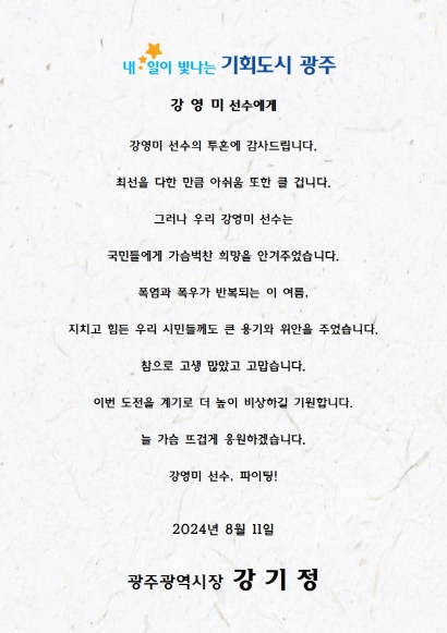 [남도저널 이운현 기자] 강기정 광주광역시장이 제33회 파리올림픽에서 열전을 펼친 전웅태, 강영미, 김재원, 이혜경, 신은철 등 광주시 소속 선수단 5명에게 11일 격려 메시지를 보냈다.