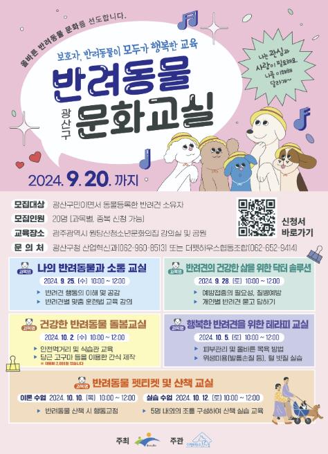 반려동물 문화교실은 과목별 20명씩 선착순으로 모집하고, 오는 9월 20일까지 구글 폼으로 신청하면 된다.
