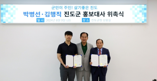 [남도저널 김승귀 기자] 진도군은 지난 9일 순천세계수석박물관 관장 박병선과 진도군청 소속 당구선수 김행직을 홍보대사로 위촉했다.