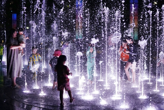 낮 동안에도 바닥분수에서 물놀이를 즐기는 어린이들과 가족들이 대거 몰리면서 인근 음식점과 상가까지 호황을 누리고 있다.