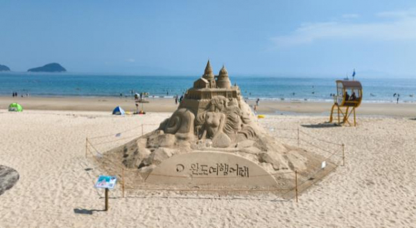 [남도저널 양용숙 기자] 고운 모래, 깨끗한 바다로 남해안 최고의 여름 피서지로 꼽히는 완도 신지 명사십리 해수욕장에 모래조각 작품이 완성돼 눈길을 끌고 있다.