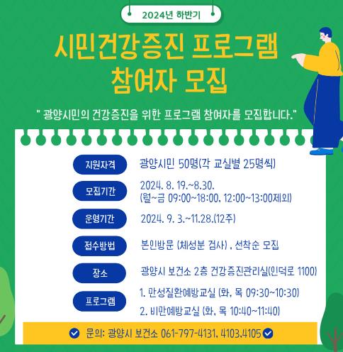 [남도저널 김영도 기자] 광양시보건소는 오는 9월 3일부터 11월 28일까지 지역주민을 대상으로 규칙적인 신체활동과 건강증진을 위한 하반기'시민건강증진 프로그램'을 운영한다고 14일 밝혔다.