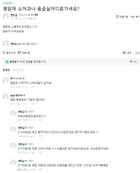 [남도저널 김승귀 기자] “영암에(서는) 소아과나 응급실 어디로 가세요?” “영암은 나주까지 나와야 할 거 같아요 … 영암 목포랑도 가깝지 않나요?” “차로 45분 정도 걸려요 … 에고 광주까진 1시간이고 이런 조건은 애 키우기 힘드네요ㅜ … 서울이랑 경기도 살다 왔는데, 속상한 밤이네요 … 아픈 얘를 데리고 차로 1시간은 너무 가혹해요.”
