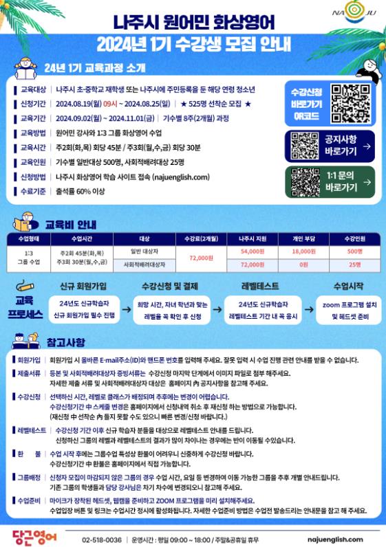 1기 교육을 희망하는 학생들은 나주시 화상영어 홈페이지에서 신청하면 된다.