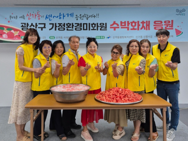 신가동 마을공동체인 ‘신풍사공’, 신가동 바르게살기위원회원 등 11명은 16일 광산구 생활환경종합센터(월전동)를 찾아 광산구 시설관리공단 소속 청소노동자 200명에게 수박화채를 전달했다.