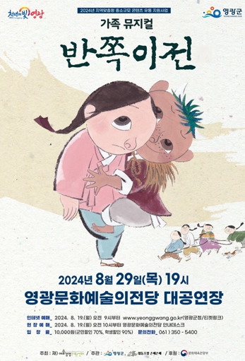 [남도저널 김종훈 기자] 영광군은 오는 8월 29일 오후 7시에 영광문화예술의전당 대공연장에서 ‘가족뮤지컬 반쪽이전’을 공연한다.