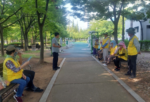 조동수 중마동장과 동사무소 직원들은 어르신들에게 준비해간 빵과 음료를 제공하고 온열질환 예방 기본 수칙, 응급상황 대처 요령 등을 안내했다.
