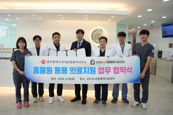 [남도저널 이운현 기자] 광주광역시우치공원관리사무소와 24시노아동물메디컬센터는 16일 동구 대인동 24시노아동물메디컬센터에서 우치동물원의 동물 의료지원을 위한 업무협약을 체결했다.