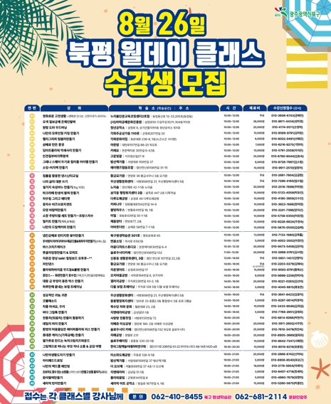 [남도저널 이운현 기자] 광주시 북구가 오는 26일 오전 10시부터 오후 9시까지 평생학습 종합 체험의 장 ‘북평-월데이클래스’ 8월 프로그램을 운영한다고 19일 밝혔다.