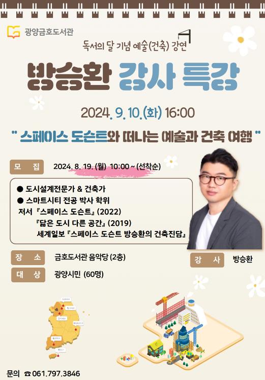 [남도저널 김영도 기자] 광양시는 9월 10일 광양금호도서관에서 독서의 달을 맞아 '스페이스 도슨트 방승환 특강'을 개최한다고 밝혔다.