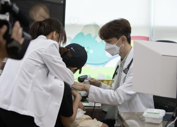 전문의는 간호사의 도움을 받으며 이비인후과에서 쓰는 ENT 유닛과 귀 내시경 등 의료기기를 이용해 아이를 진료했다. 이어 아이와 동행한 김 씨에게 아이의 상태를 설명했다.